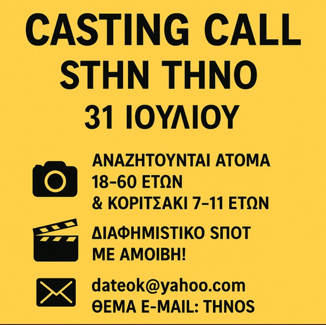 Αναζητούνται άτομα 18-60 ετών και ένα κοριτσάκι 7-11 ετών για συμμετοχή σε διαφημιστικό σποτ που θα γυριστεί την Πέμπτη 31 Ιουλίου στην Τήνο.