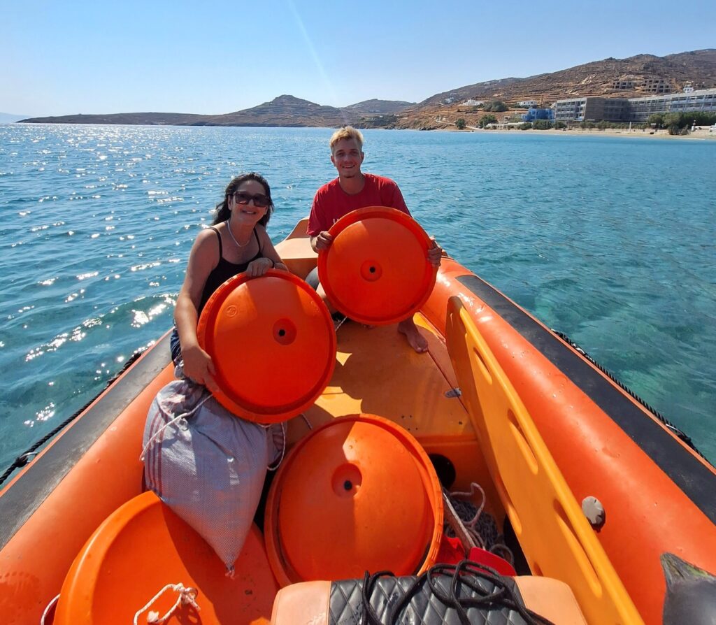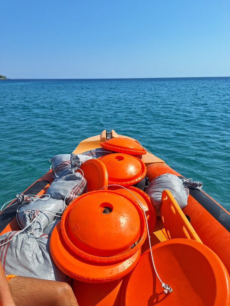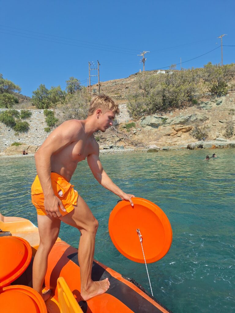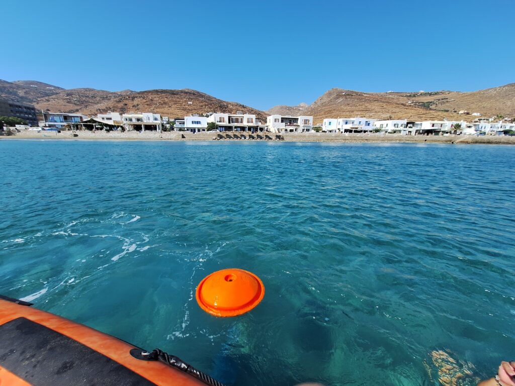 Η παραλία Κιόνια είναι η μοναδική παραλία του νησιού που διαθέτει τον συγκεκριμένο πλωτήρα.
