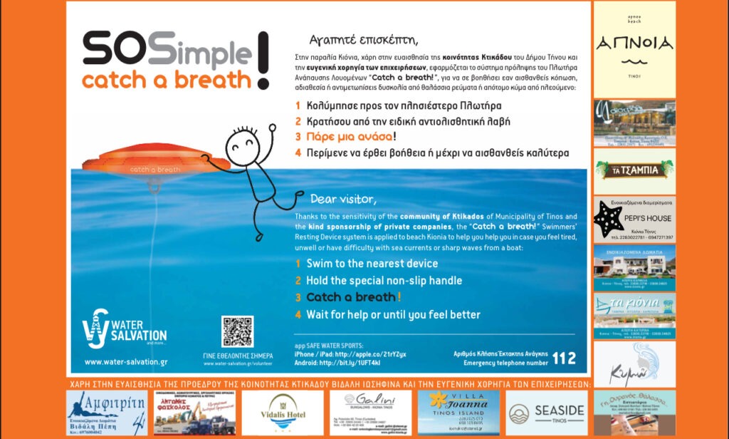 Στην παραλία Κιόνια, με την πρωτοβουλια της Κοινότητας Κτικάδου, καθώς και την ευγενική χορηγία των επιχειρήσεων της περιοχής, εφαρμόζεται το καινοτόμο σύστημα πρόληψης του πλωτήρα ανάπαυσης λουομένων «Catch a breath!».