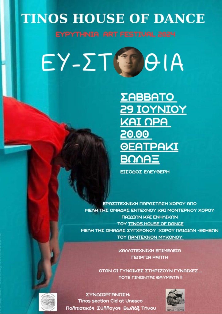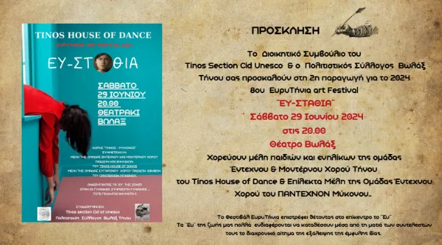 Τήνου σας προσκαλούν στη 2η παραγωγή για το 2024 8ου ΕυρυΤήνια art Festival̈ ΕΥ-ΣΤΑΘΙΑ ̈́ Σάββατο 29 Ιουνίου 2024 στις 20.00 Θέατρο Βωλάξ.