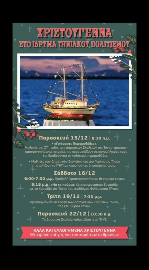 “Η Χορωδία Τήνου, στα πλαίσια των χριστουγεννιάτικων εκδηλώσεων στο Ίδρυμα Τηνιακού Πολιτισμού, θα παρουσιάσει συναυλία με ελληνικά και ξένα τραγούδια στο πνεύμα των ημερών”.