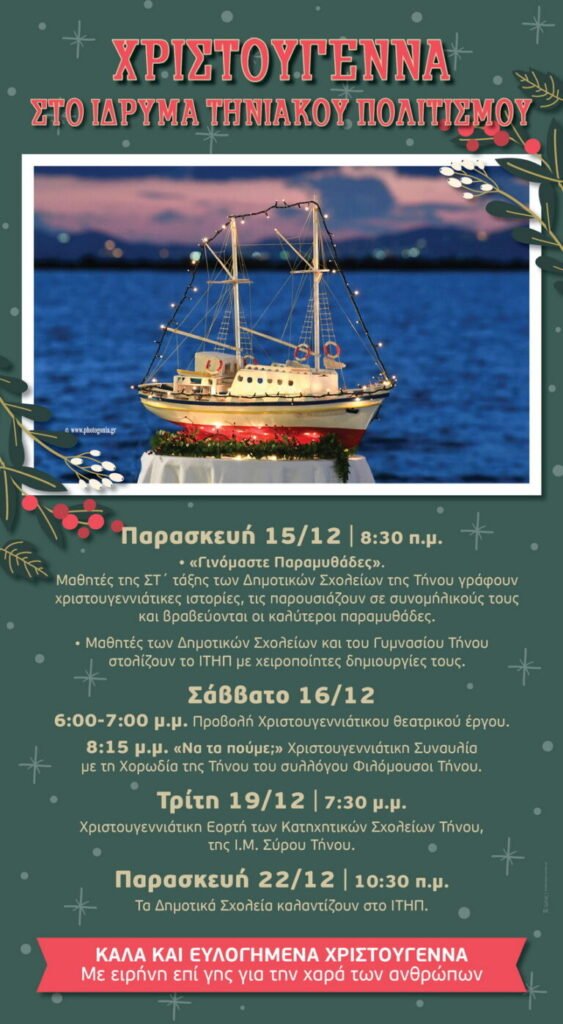 - 8:15 μ.μ., “Να τα πούμε;”. Χριστουγεννιάτικη Συναυλία με τη «Χορωδία της Τήνου» του συλλόγου «Φιλόμουσοι Τήνου», με ελληνικά και ξένα Χριστουγεννιάτικα τραγούδια και ύμνους.