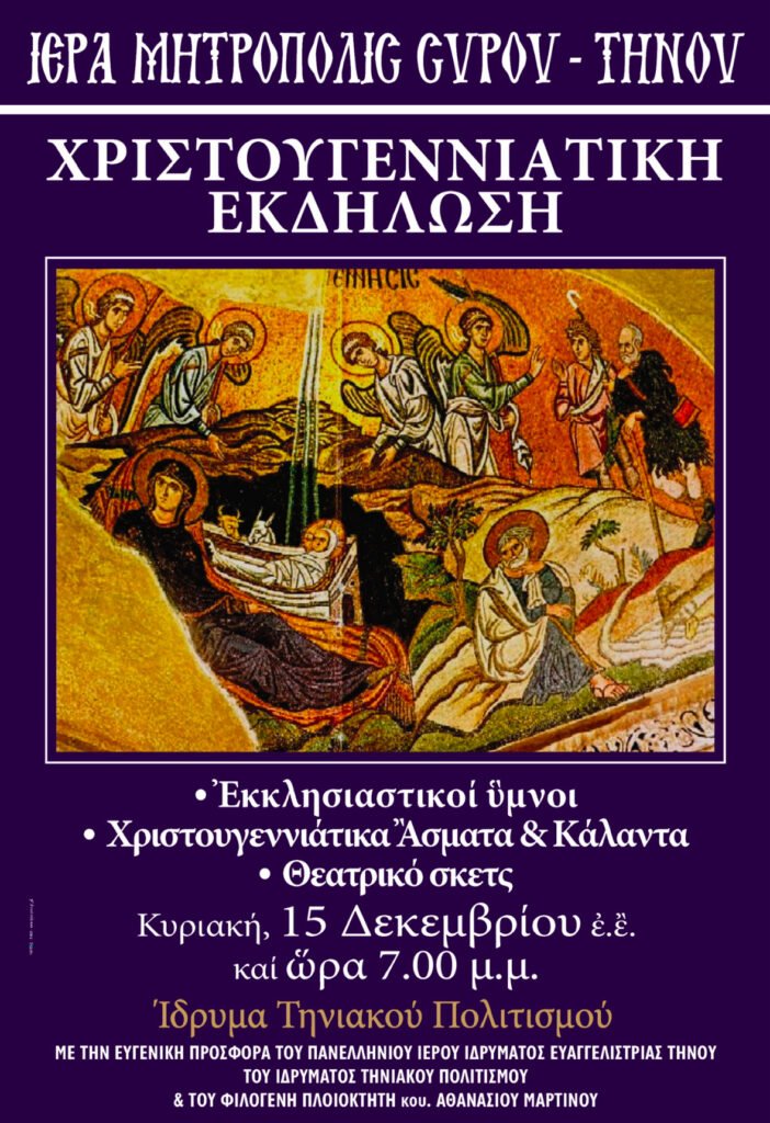 Κυριακή 15 Δεκεμβρίου και ώρα 7:00 μμ στο Ίδρυμα Τηνιακού Πολιτισμού