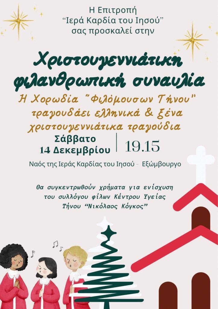 Στο πνεύμα των ημερών αυτών η επιτροπή της Ιεράς Καρδίας του Ιησού διοργανώνει για 2η συνεχόμενη χρόνια χριστουγεννιάτικη φιλανθρωπική συναυλία με τη συμμετοχή της «Χορωδίας Φιλόμουσων Τήνου», το Σάββατο 14 Δεκεμβρίου 2024 στις 18.45 στο Ναό της Ιεράς Καρδίας του Ιησού, στο Εξώμβουργο.