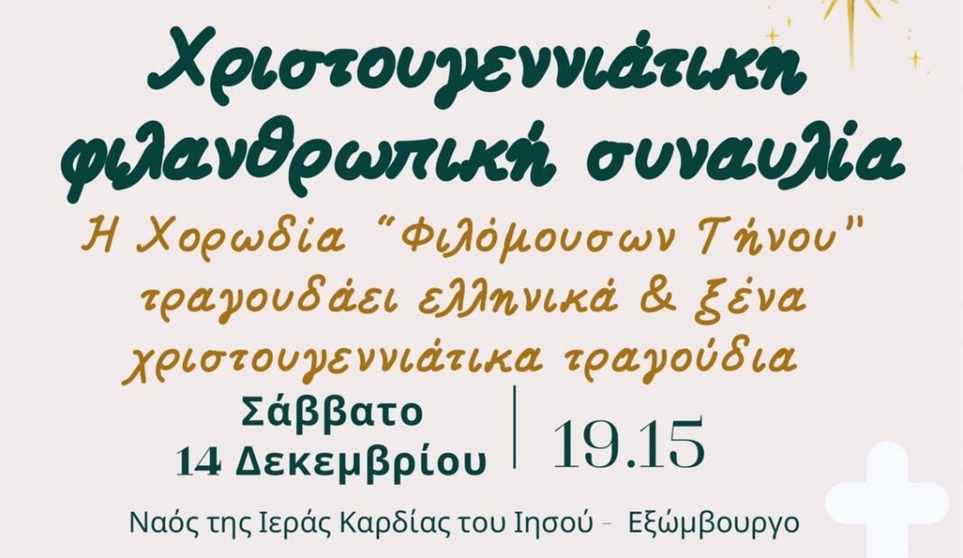 Στο πνεύμα των ημερών αυτών η επιτροπή της Ιεράς Καρδίας του Ιησού διοργανώνει για 2η συνεχόμενη χρόνια χριστουγεννιάτικη φιλανθρωπική συναυλία με τη συμμετοχή της «Χορωδίας Φιλόμουσων Τήνου», το Σάββατο 14 Δεκεμβρίου 2024 στις 18.45 στο Ναό της Ιεράς Καρδίας του Ιησού, στο Εξώμβουργο.