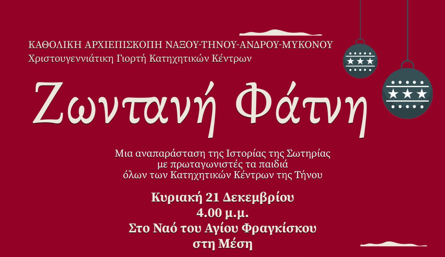 Η Καθολική Αρχιεπισκοπή Νάξου–Τήνου–Άνδρου–Μυκόνου διοργανώνει τη Χριστουγεννιάτικη Γιορτή των Κατηχητικών Κέντρων με τίτλο «Ζωντανή Φάτνη», μια ξεχωριστή εκδήλωση αφιερωμένη στο αληθινό νόημα των Χριστουγέννων.