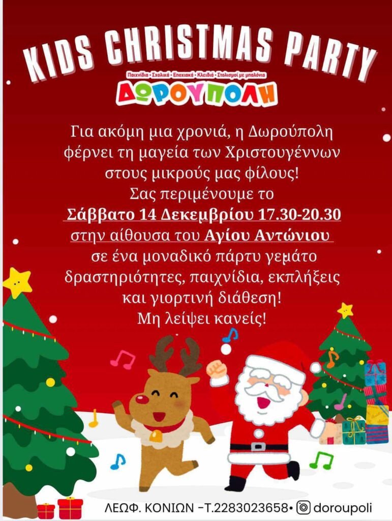 Η Δωρούπολη φέρνει και φέτος τη μαγεία των Χριστουγέννων στους μικρούς μας φίλους! Το Σάββατο, 14 Δεκεμβρίου, από τις 17:30 έως τις 20:30, σας περιμένουμε στην αίθουσα του Αγίου Αντωνίου για ένα μοναδικό πάρτι γεμάτο δραστηριότητες, παιχνίδια, εκπλήξεις και γιορτινή διάθεση. Μην το χάσετε!