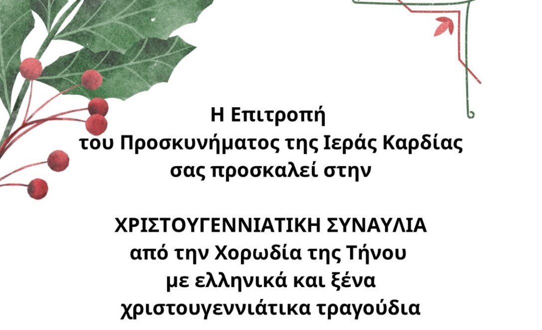 Στο πνεύμα των ημερών αυτών η επιτροπή της Ιεράς Καρδίας του Ιησού διοργανώνει χριστουγεννιάτικη φιλανθρωπική συναυλία με τη συμμετοχή της χορωδίας Τήνου, την Κυριακή 10 Δεκεμβρίου 2023 στις 18:15 στο Ναό της Ιεράς Καρδίας του Ιησού, στο Εξώμβουργο.