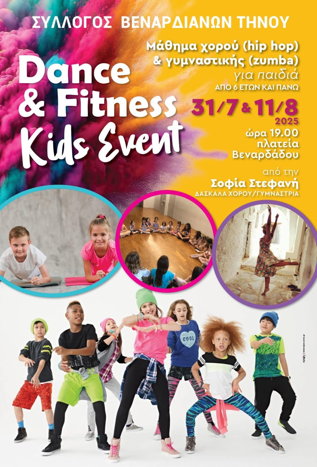 Στην όμορφη πλατεία του χωριού μας, 11 Αυγούστου, στις 19.00, η χορεύτρια και γυμνάστρια Σοφία Στεφανή, θα κρατήσει και πάλι συντροφιά στα παιδιά με γυμναστική zumba και χορό hip hop.