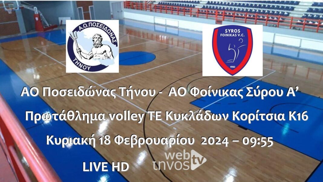 Παρακολουθήστε την Κυριακή 18 Φεβρουαρίου 2024 στις 09:55 τον αγώνα Α.Ο. Ποσειδώνας – ΑΟ Φοίνικας για το Πρωτάθλημα volley TE Κυκλάδων Κορίτσια Κ16