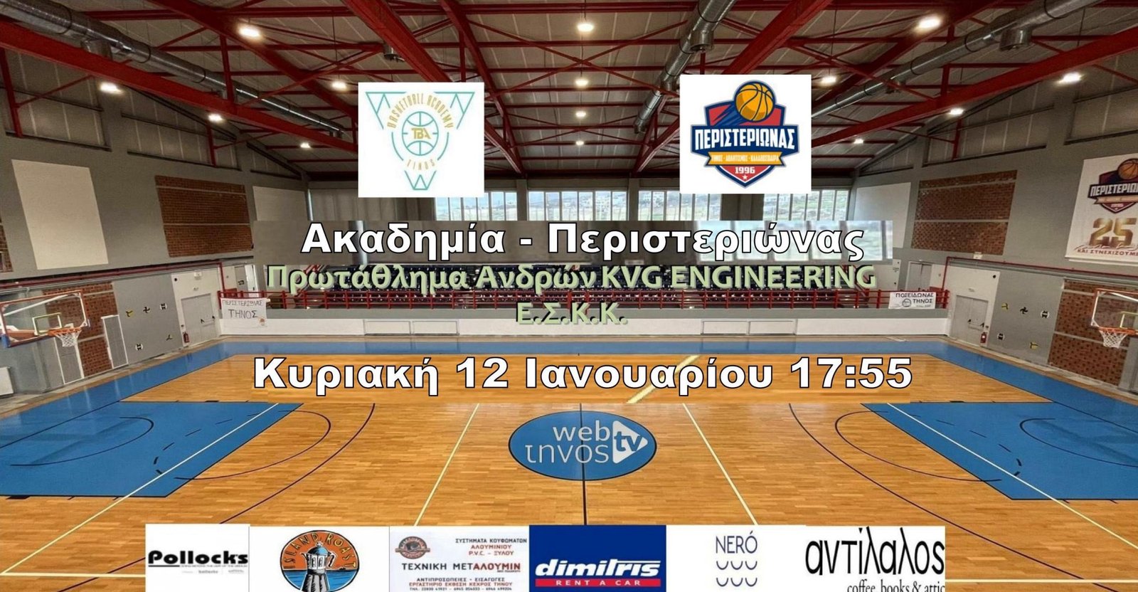 Παρασκολουθήστε την Κυριακή 12 Ιανουαρίου 2025 στις 17:55 τον αγώνα μεταξύ των ομάδων Ακαδημία Καλαθοσφ. Τήνου – ΤΑΚ Περιστεριώνας για το Πρωτάθλημα Ανδρών KVG Engineering της Ε.Σ.Κ.Κ.