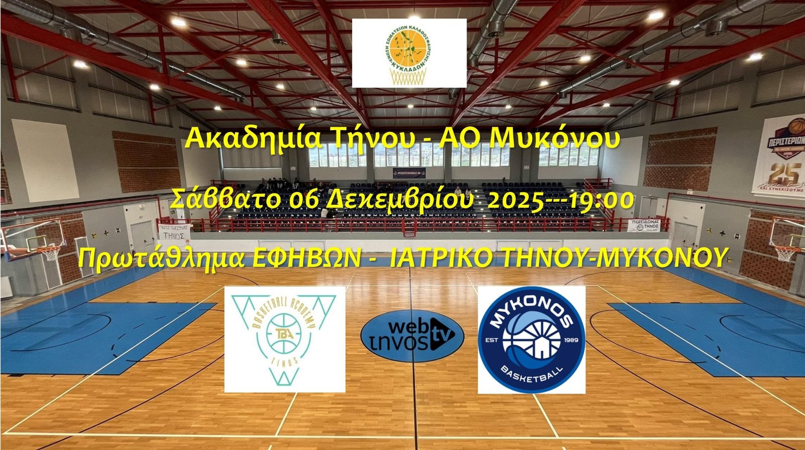 Παρακολουθήστε το Σάββατο 06 Δεκεμβρίου 2025 στις 19:00 τον αγώνα μεταξύ των ομάδων Ακαδημία Τήνου – ΑΟ Μυκόνου για το Πρωτάθλημα Εφήβων – ΓΕΩΡΓΟΥΛΙΟΣ ΙΑΤΡΙΚΟ ΤΗΝΟΥ-ΜΥΚΟΝΟΥ της Ε.Σ.Κ.Κ..