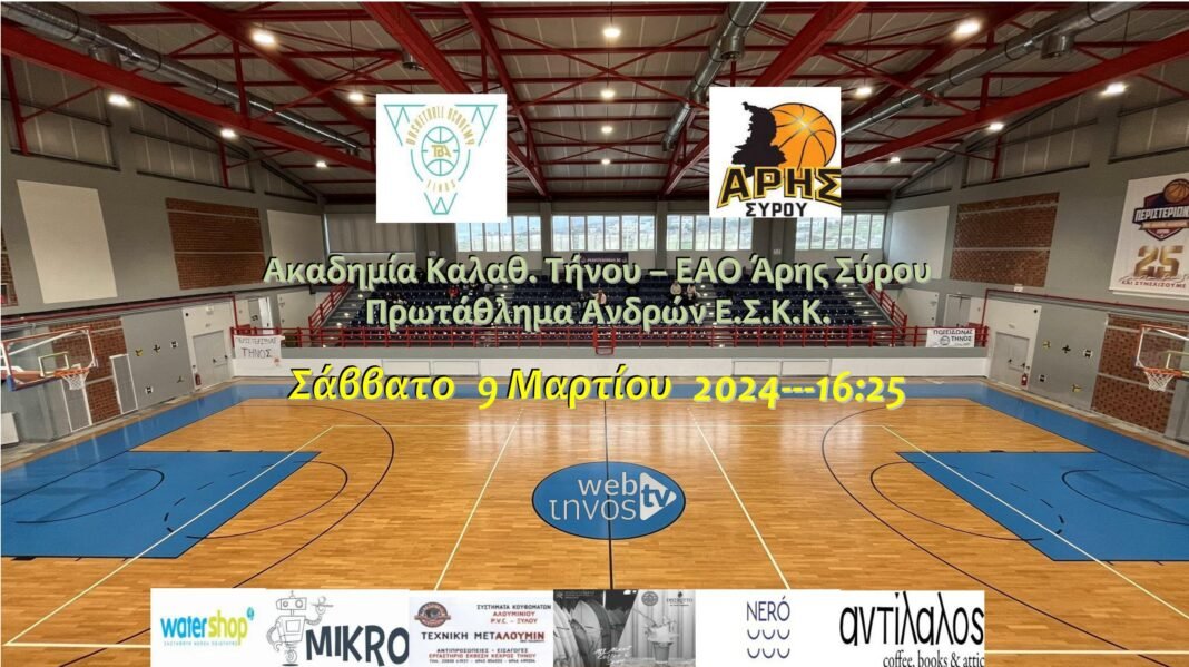 Παρακολουθήστε ζωντανά το Σάββατο 9 Μαρτίου 2024 στις 16:25 τον αγώνα Ακαδημία Καλαθ. Τήνου – ΕΑΟ Άρης Σύρου για το Πρωτάθλημα Ανδρών Ε.Σ.Κ.Κ.