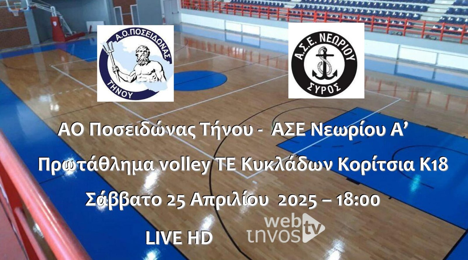 Παρακολουθήστε το Σάββατο 25 Απριλίου 2025 στις 6:00μμ τον αγώνα ΑΟ Ποσειδώνας Τήνου – ΑΣΕ Νεωρίου Α’ για το Πρωτάθλημα volley TE Κυκλάδων Κορίτσια Κ18