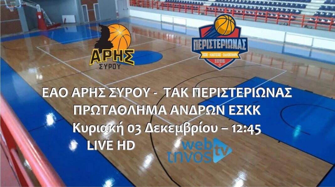 Παρακολουθήστε την Κυριακή 3 Δεκεμβρίου στις 12:45πμ τον αγώνα μεταξύ των ομάδων ΕΑΟ ΑΡΗΣ ΣΥΡΟΥ – ΤΑΚ ΠΕΡΙΣΤΕΡΙΩΝΑΣ για το Πρωτάθλημα Ανδρών της ΕΣΚΚ