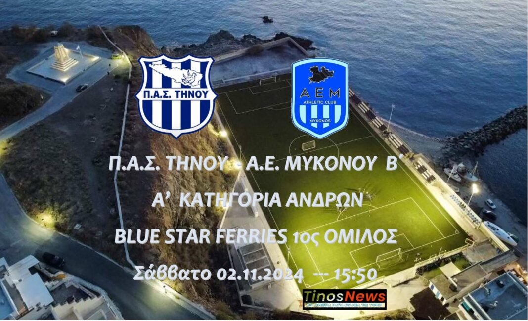 Παρακολουθήστε το Σάββατο 2 Νοεμβρίου 2024 στις 15:50 τον αγώνα μεταξύ των ομάδων Π.Α.Σ. ΤΗΝΟΥ – Α.Ε. ΜΥΚΟΝΟΥ Β΄ για το πρωτάθλημα Α’ ΚΑΤΗΓΟΡΙΑ ΑΝΔΡΩΝ BLUE STAR FERRIES 1ος ΟΜΙΛΟΣ