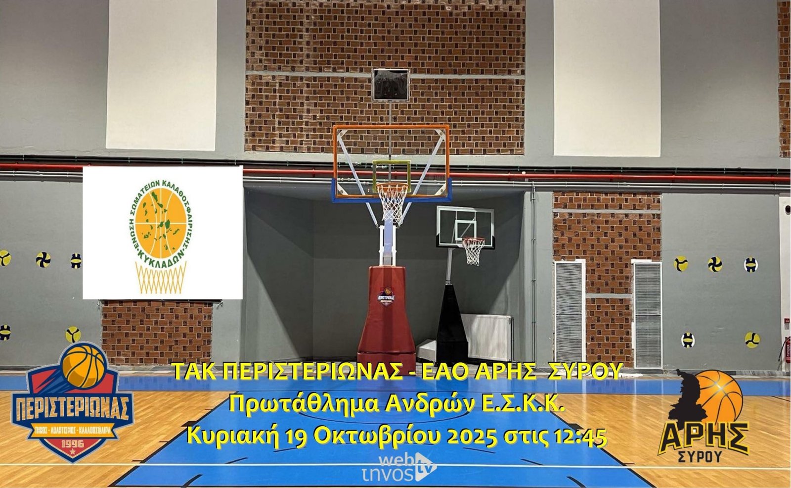 Παρακολουθήστε την Κυριακή 19 Οκτωβρίου 2025 στις 12:45 τον αγώνα μεταξύ των ομάδων ΤΑΚ Περιστεριώνα και Άρη Σύρου για το Πρωτάθλημα Ανδρών της Ε.Σ.Κ.Κ..