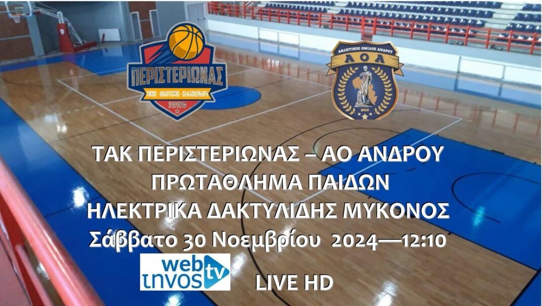 Παρακολουθήστε το Σάββατο 30 Νοεμβρίου 2024 στις 12:10 τον αγώνα μεταξύ των ομάδων ΤΑΚ Περιστεριώνας – ΑΟ Άνδρου για το Πρωτάθλημα Εφήβων Παίδων “ΗΛΕΚΤΡΙΚΑ ΔΑΚΤΥΛΙΔΗΣ ΜΥΚΟΝΟΣ”