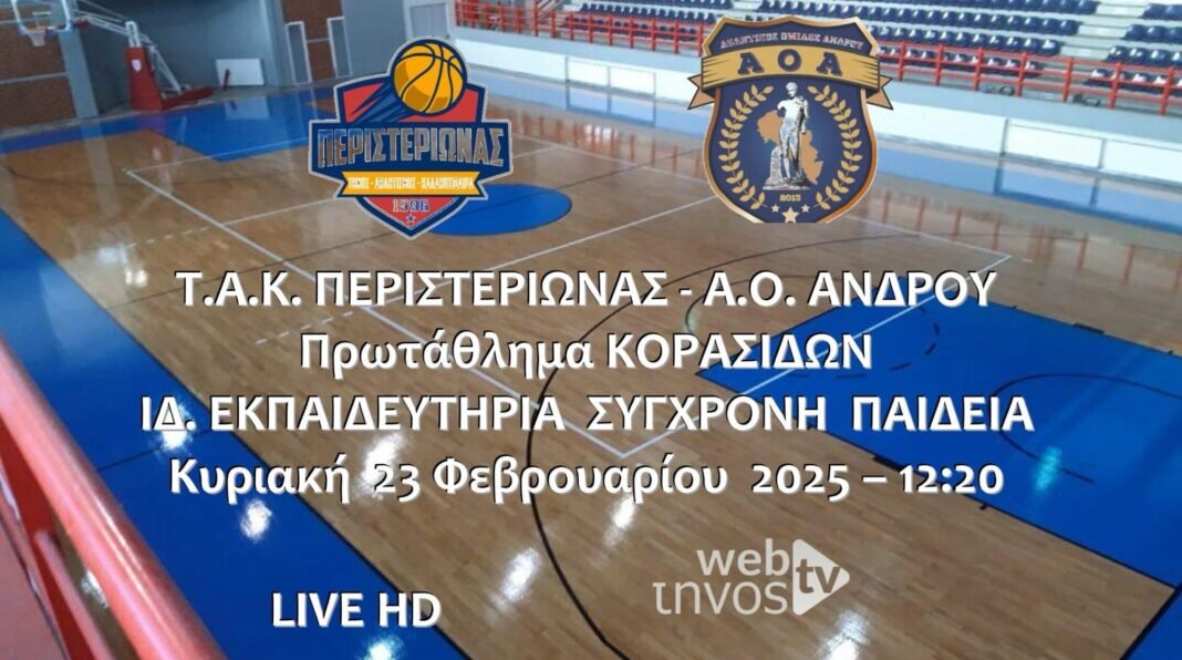 Παρακολουθήστε την Κυριακή 23 Φεβρουαρίου 2025 στις 12:20 τον αγώνα μεταξύ των ομάδων T.A.K. ΠΕΡΙΣΤΕΡΙΩΝΑΣ – A.O. ΑΝΔΡΟΥ για το Πρωτάθλημα ΚΟΡΑΣΙΔΩΝ “ΙΔ. ΕΚΠΑΙΔΕΥΤΗΡΙΑ ΣΥΓΧΡΟΝΗ ΠΑΙΔΕΙΑ”