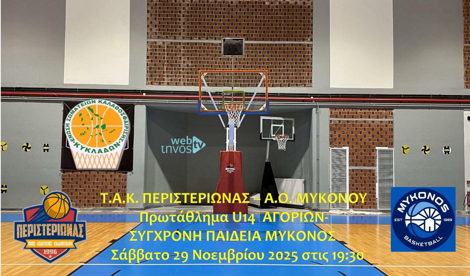 Παρακολουθήστε το Σάββατο 29 Νοεμβρίου 2025 στις 19:30 τον αγώνα μεταξύ των ομάδων ΤΑΚ Περιστεριώνα και ΑΟ Μυκόνου για το Πρωτάθλημα U14 Αγοριών ΣΥΓΧΡΟΝΗ ΠΑΙΔΕΙΑ ΜΥΚΟΝΟΣ της Ε.Σ.Κ.Κ..