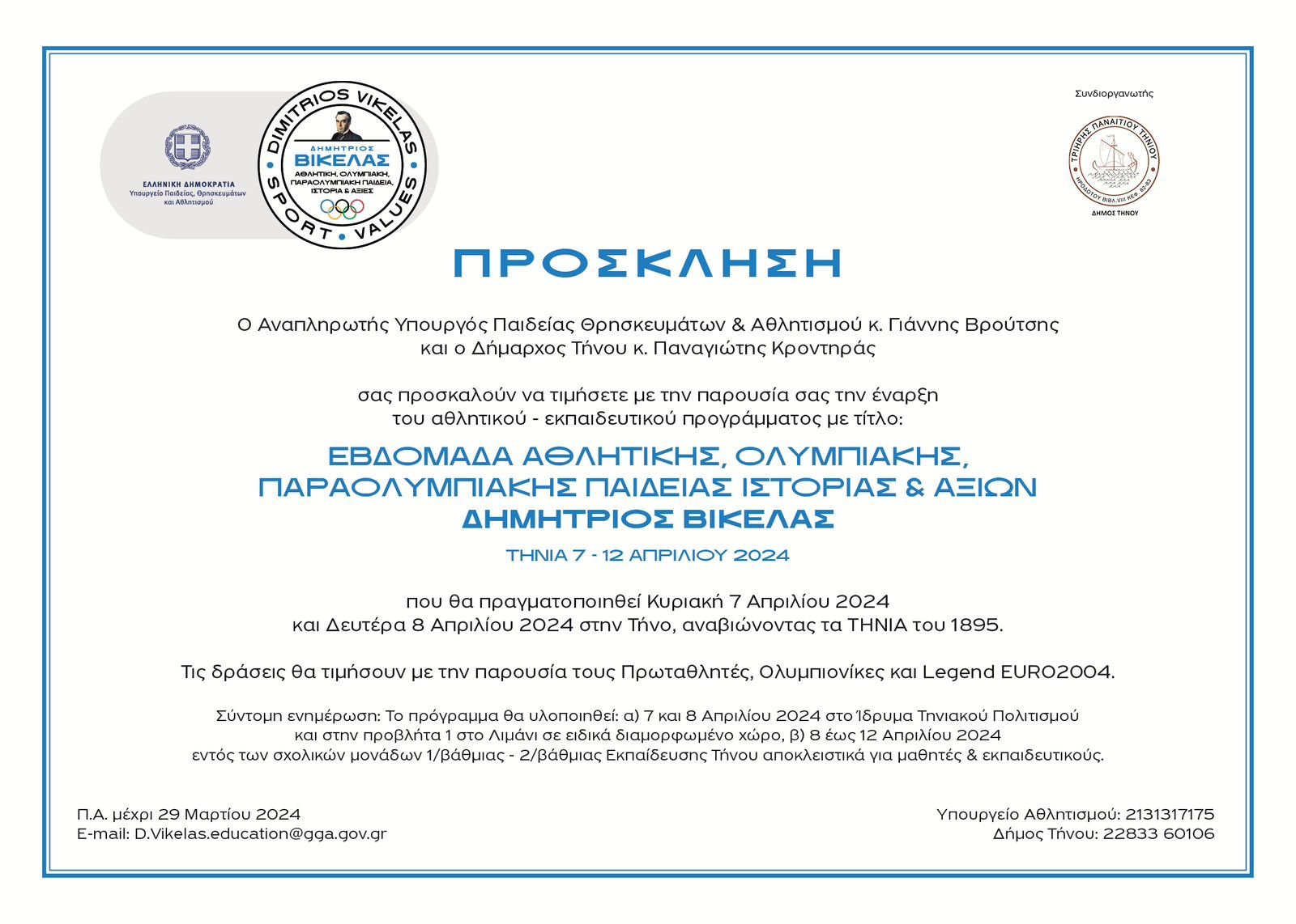 11:30 Τελετή Έναρξης του προγράμματος: Εβδομάδα Αθλητικής, Ολυμπιακής, Παραολυμπιακής Παιδείας Ιστορίας & Αξιών ΔΗΜΗΤΡΙΟΣ ΒΙΚΕΛΑΣ – ΤΗΝΙΑ 7 – 12 Απριλίου 2024, στο Ίδρυμα Τηνιακού Πολιτισμού.
