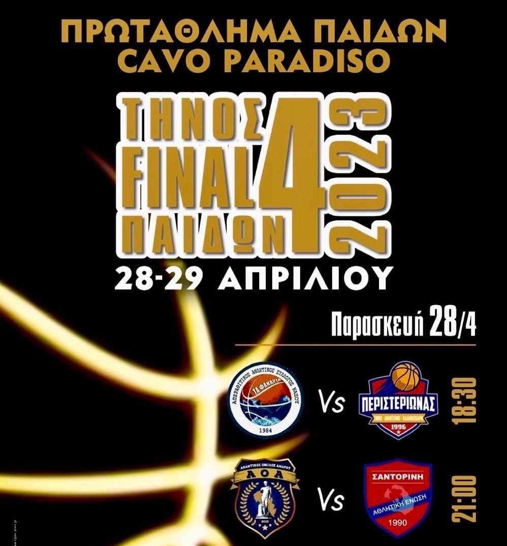 Δείτε Live τους αγώνες στο Πρωτάθλημα (F4) Παίδων Cavo Paradiso που θα πραγματοποιηθεί στην Τήνο σήμερα 28 Απριλίου.