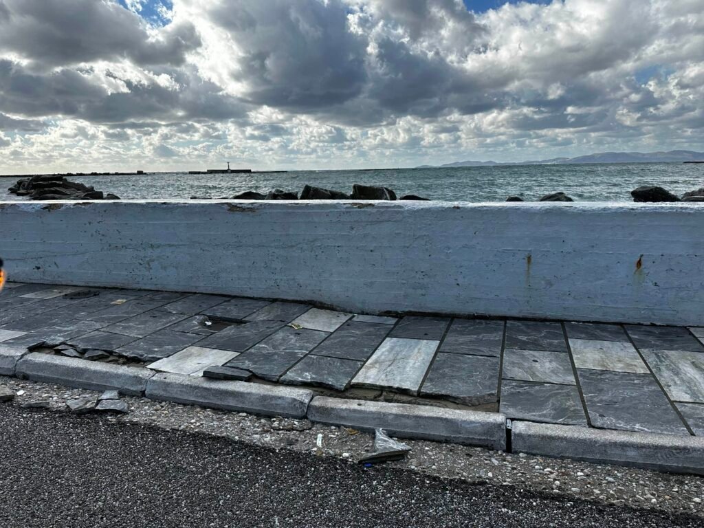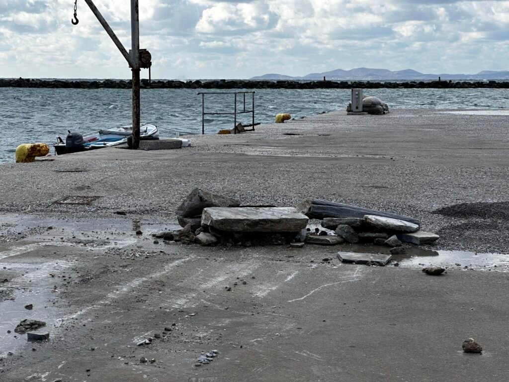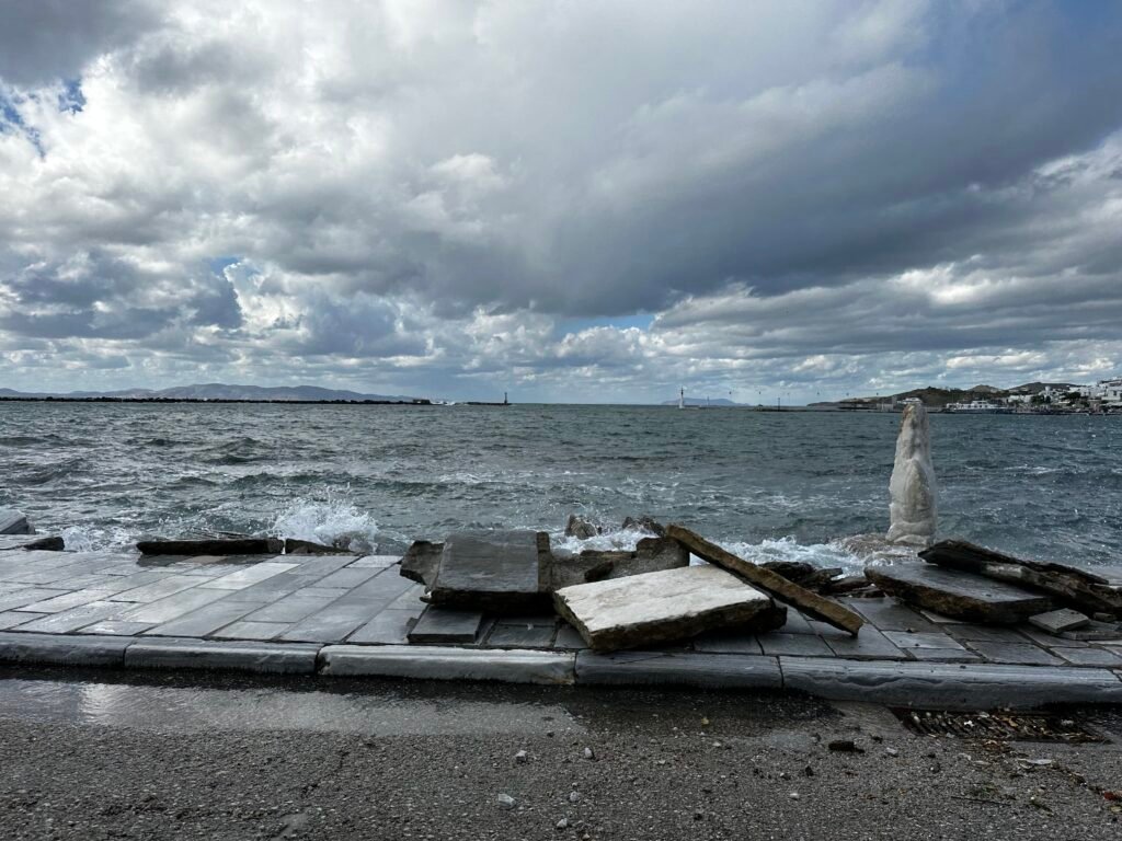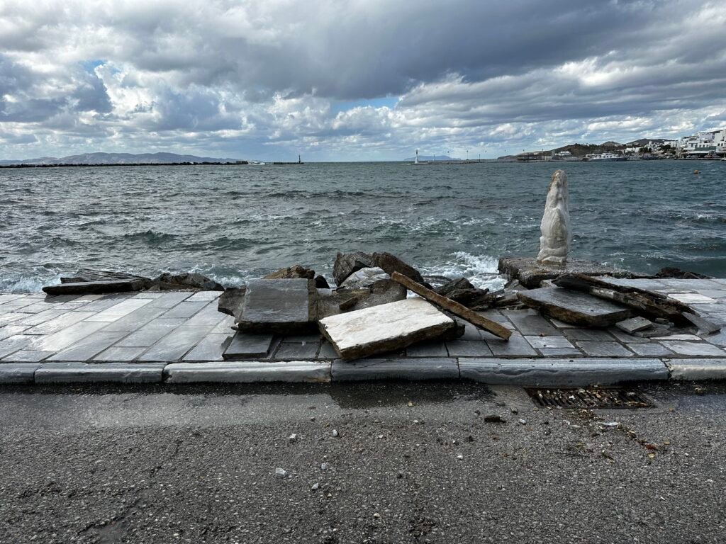 Πιο συγκεκριμένα, ξηλώθηκαν μάρμαρα πεζοδρομίου, καρέκλες και τραπέζια από επιχειρήσεις εστίασης μετακινήθηκαν, δέντρα κόπηκαν, αμάξια κόλλησαν μεταξύ τους, τα κάγκελα του λιμανιού έσπασαν και μετακινήθηκαν, καλώδια βγήκαν στην επιφάνεια και μερικά κόπηκαν, ενώ πέτρες και άμμο αντικρίζουμε στους δρόμους γύρω από τα νότια παραθαλάσσια τμήματα του νησιού.