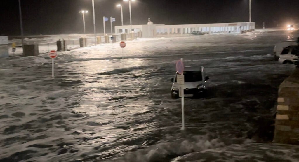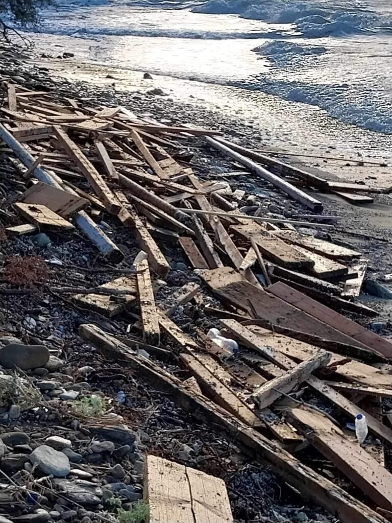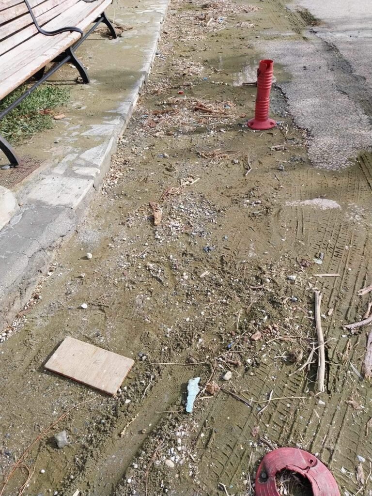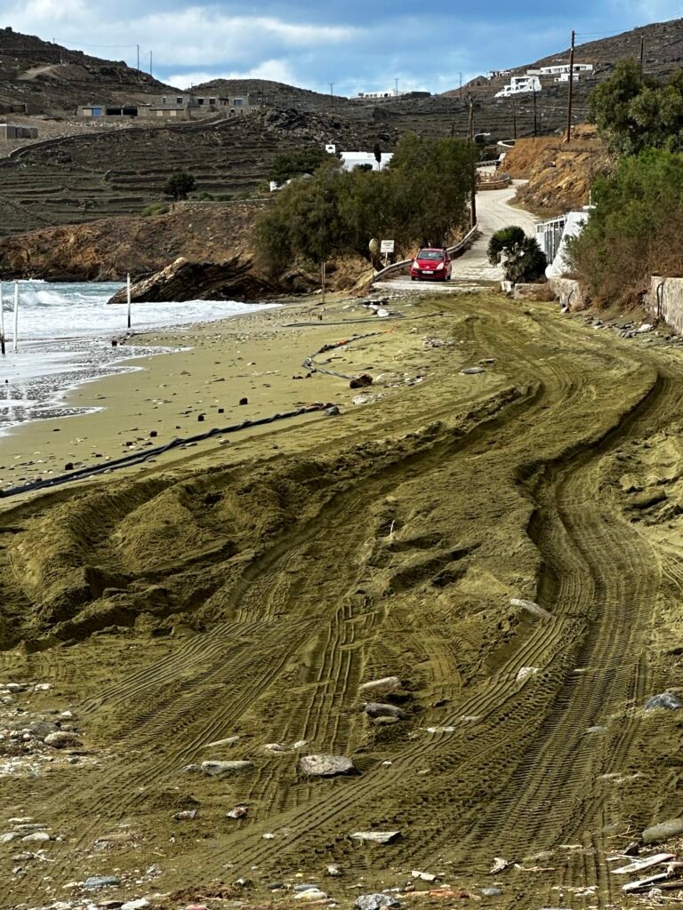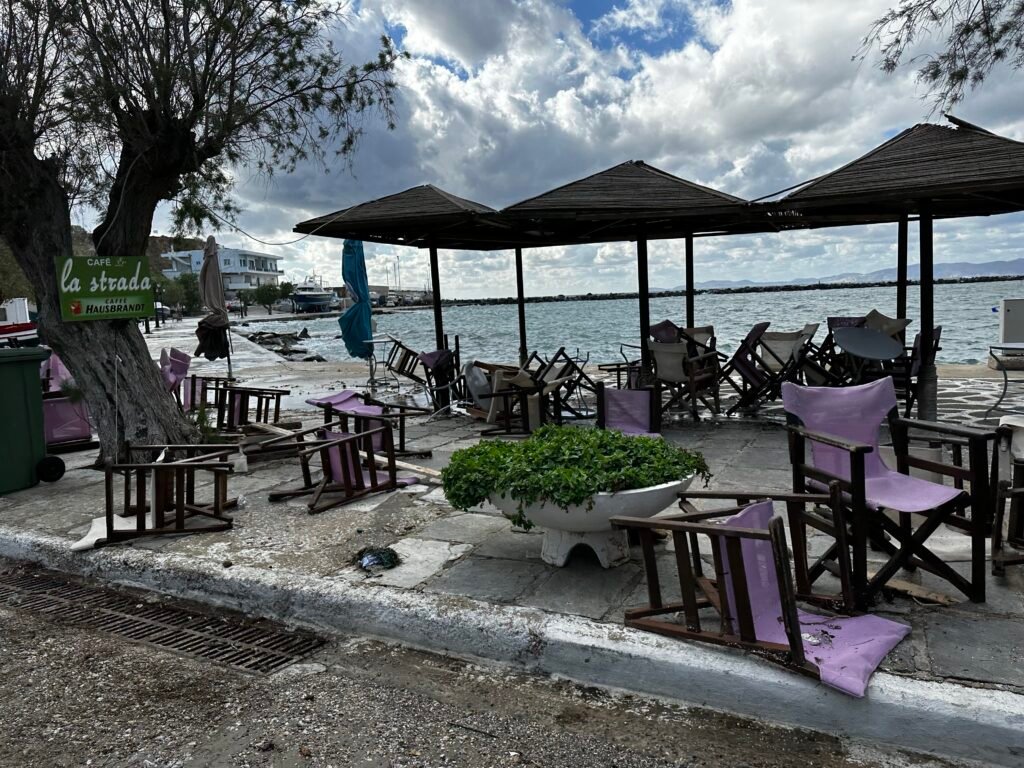 Πιο συγκεκριμένα, ξηλώθηκαν μάρμαρα πεζοδρομίου, καρέκλες και τραπέζια από επιχειρήσεις εστίασης μετακινήθηκαν, δέντρα κόπηκαν, αμάξια κόλλησαν μεταξύ τους, τα κάγκελα του λιμανιού έσπασαν και μετακινήθηκαν, καλώδια βγήκαν στην επιφάνεια και μερικά κόπηκαν, ενώ πέτρες και άμμο αντικρίζουμε στους δρόμους γύρω από τα νότια παραθαλάσσια τμήματα του νησιού.