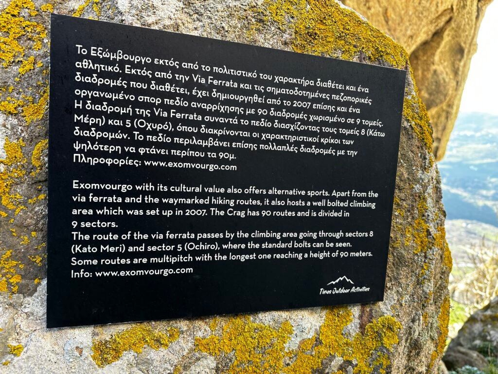Στην καρδιά της Τήνου και συγκεκριμένα στο λόφο του Εξωμβούργου δημιουργήθηκε η μεγαλύτερη via ferrata των Κυκλάδων. Μία εύκολη κυκλική διαδρομή με μήκος 1000μ. απλώνεται περιφερειακά του βουνού. Απότομες πλαγιές, χαράδρες και μικρά περάσματα προσφέρουν μια μοναδική πεζοπορική εμπειρία, ενώ η θέα από ψηλά καθόλη την διαδρομή, σε γεμίζει με πλούσιες εικόνες.