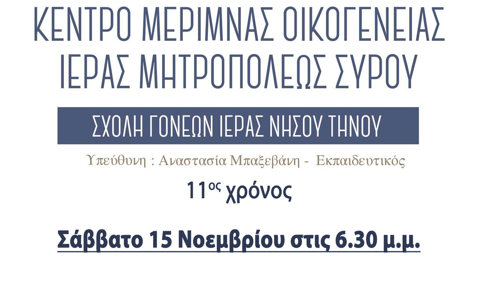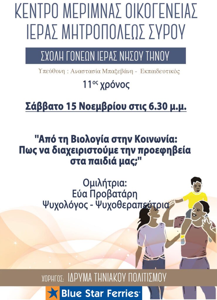 Το Κέντρο Μέριμνας Οικογένειας της Ιεράς Μητροπόλεως Σύρου, στο πλαίσιο της Σχολής Γονέων Ιεράς Νήσου Τήνου, διοργανώνει το Σάββατο 15 Νοεμβρίου 2025, στις 6:30 μ.μ., ομιλία με θέμα: