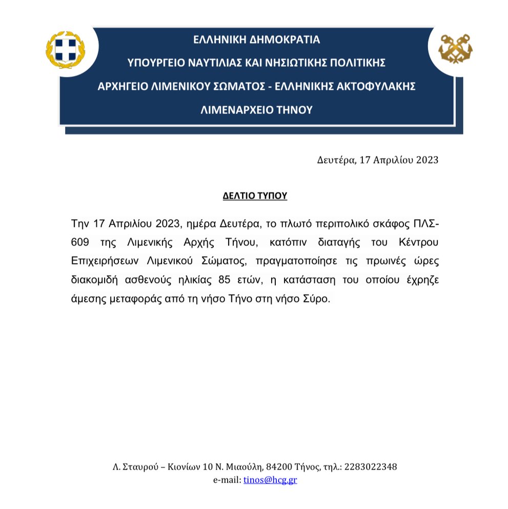 ΠΛΣ-609 της Λιμενικής Αρχής Τήνου, κατόπιν διαταγής του Κέντρου Επιχειρήσεων Λιμενικού Σώματος, πραγματοποίησε τις πρωινές ώρες