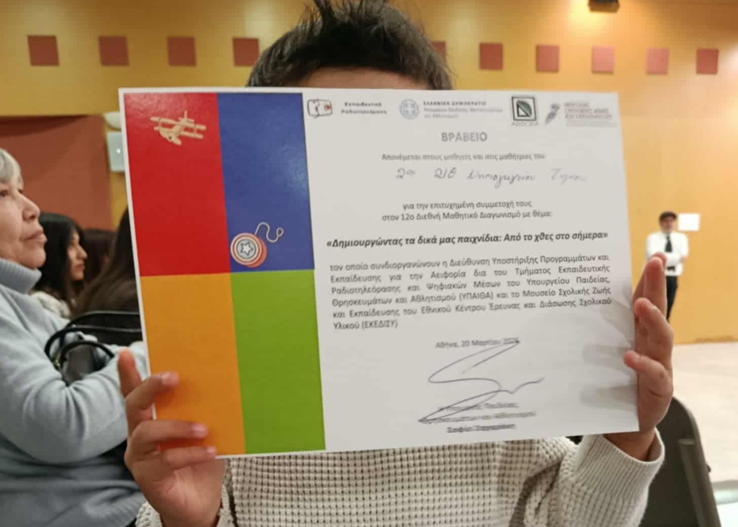 Σε μια ξεχωριστή εκδήλωση στο Υπουργείο Παιδείας Θρησκευμάτων και Αθλητισμού, με συμμετοχή σχολείων απ.ολη την Ελλάδα, την Κύπρο και την Ομογένεια, την Παρασκευή 20 Μαρτίου, το 2ο 2/θ Νηπιαγωγείο Τήνου βραβεύτηκε στον 12ο Μαθητικό διαγωνισμό διαγωνισμό που διοργανώθηκε από το Μουσείο Σχολικής Ζωής και Εκπαίδευσης με θέμα ” Δημιουργώντας τα δικά μας παιχνίδια. Από το χθες στο σήμερα”.