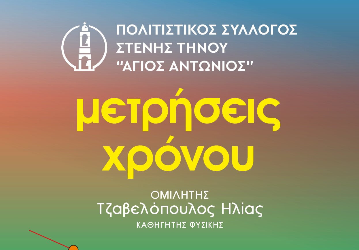 Την Τετάρτη 13 Αυγούστου 2025, στις 7:00 μ.μ., στο Βερδάρειο Πνευματικό Κέντρο Καμάρι Στενής, ο Πολιτιστικός Σύλλογος Στενής Τήνου «Άγιος Αντώνιος» διοργανώνει διάλεξη με θέμα «Μετρήσεις Χρόνου». Ομιλητής θα είναι ο καθηγητής Φυσικής Ηλίας Τζαβελόπουλος, ο οποίος θα παρουσιάσει τις “Μετρήσεις Χρόνου”.