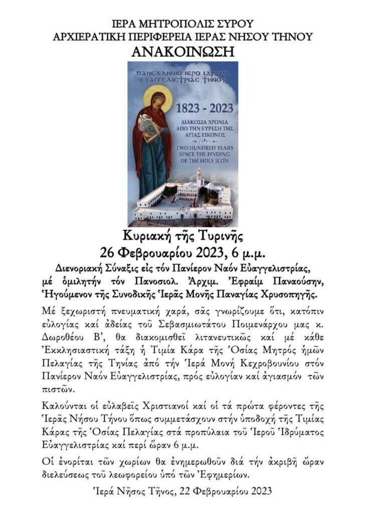 Ἱερά Νῆσος Τῆνος, 22 Φεβρουαρίου 2023