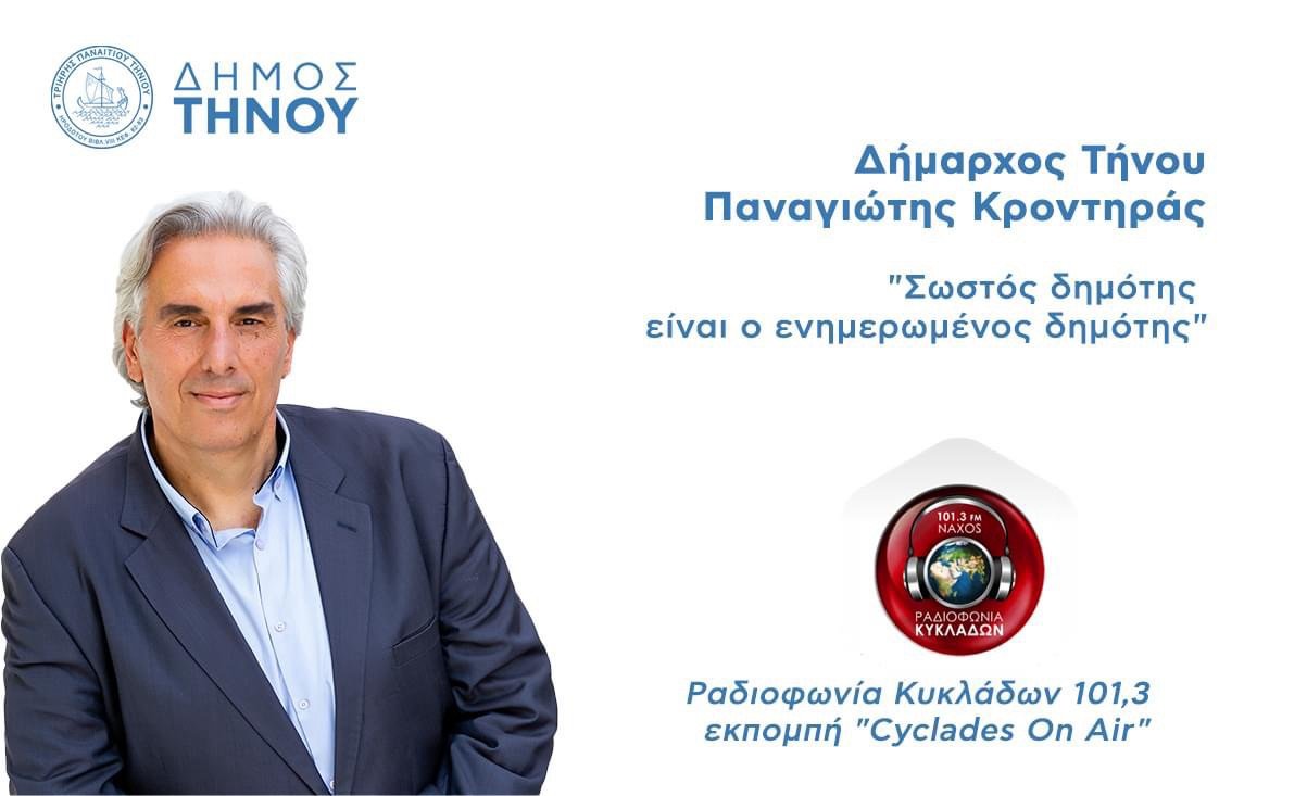 Ο Παναγιώτης Κροντηράς – Δήμαρχος Τήνου φιλοξενήθηκε στη συχνότητα της Ραδιοφωνίας Κυκλάδων 101,3 και στην εκπομπή “Cyclades On Air” και μας μίλησε για ζητήματα που αφορούν στο Δήμο και κατά συνέπεια στους Δημότες της Τήνου.