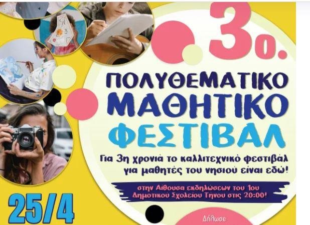 Στο πλαίσιο αυτό, θα πραγματοποιήσει την Παρασκευή 25 Απριλίου, το 3ο Μαθητικό Φεστιβάλ, για τους μαθητές του νησιού, αλλά και για πρώτη φορά και εκτός της Τήνου, με σκοπό, όπως δηλώνει στην “Κοινή Γνώμη”, να δώσει στους μαθητές την ευκαιρία να εκφραστούν, μέσα από τη μουσική, την ποίηση, τη χορογραφία και το θέατρο.