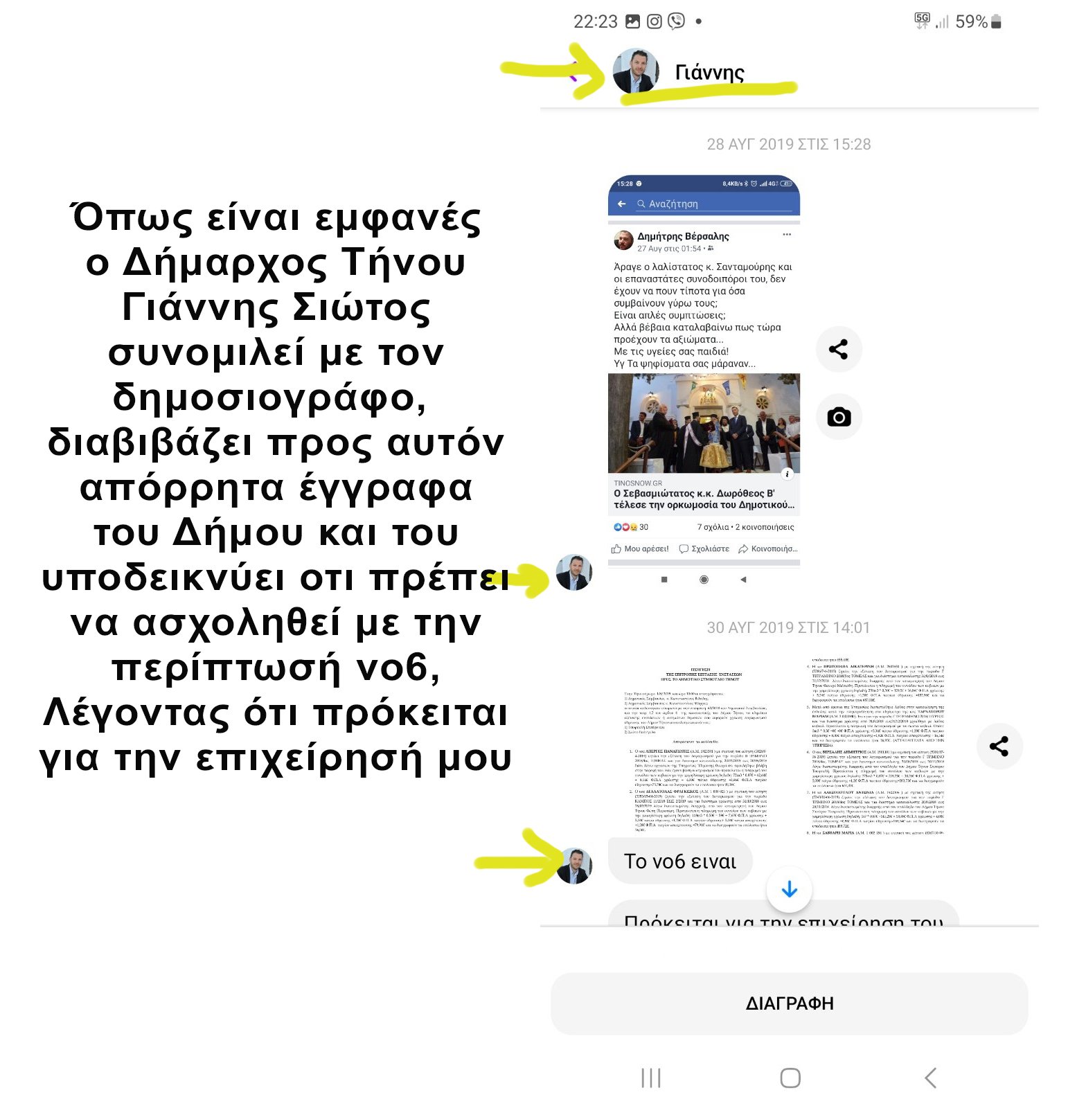 Αυτός λοιπόν υπήρξε από την πρώτη μέρα της θητείας του ο κ. ΓΙΑΝΝΗΣ ΣΙΩΤΟΣ, ο απερχόμενος Δήμαρχος Τήνου. Ένας άνθρωπος που χρησιμοποίησε τα αρχεία του Δήμου με τα ευαίσθητα δεδομένα που αυτά περιείχαν για να αφανίσει έναν πολιτικό του “αντίπαλο”. Και ασφαλώς δεν διεκδικώ να είμαι το μόνο θύμα μιας τέτοιας νοοτροπίας…