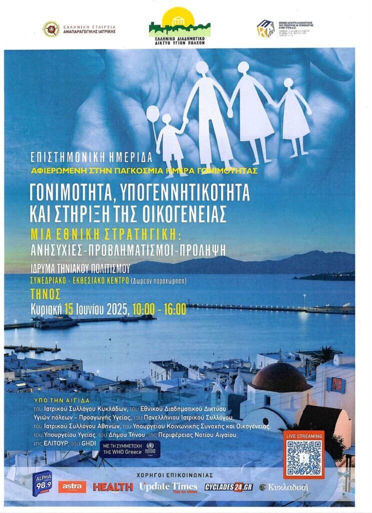 Την Κυριακή 15 Ιουνίου 2025, διοργανώνεται Επιστημονική Ημερίδα αφιερωμένη στην Παγκόσμια Ημέρα Γονιμότητας, με θέμα: “Γονιμότητα – Υπογεννητικότητα και στήριξη της Οικογένειας. Μία Εθνική Στρατηγική : Ανησυχίες – Προβληματισμοί – Πρόληψη”