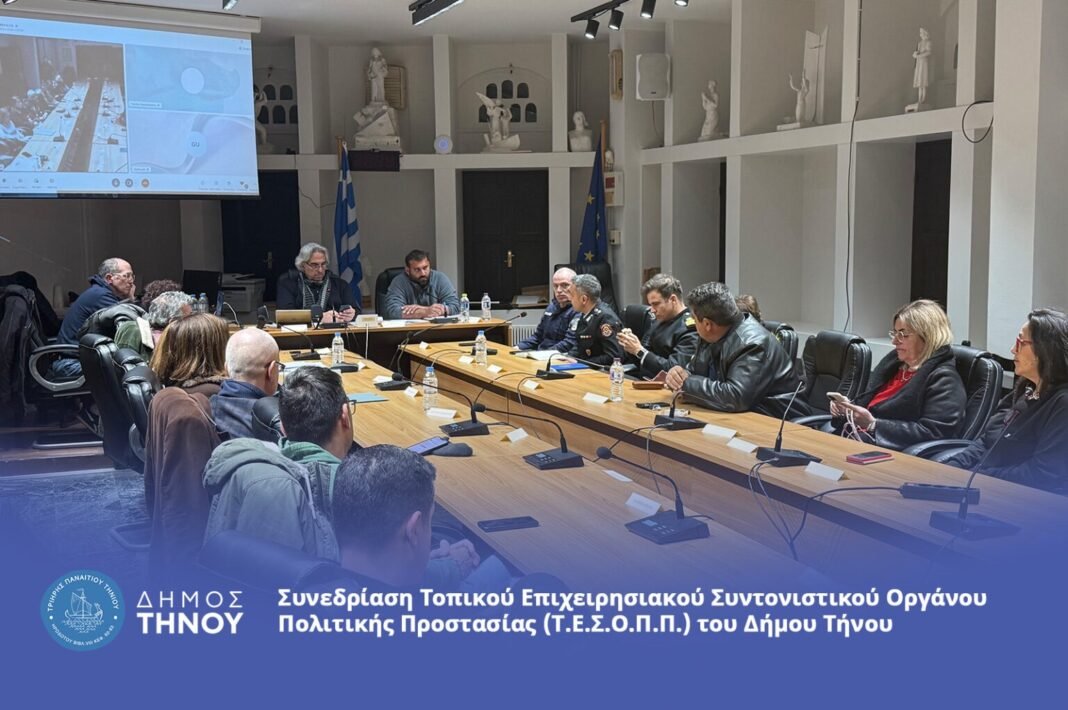 Στη συνέχεια, ακολούθησε η έκτακτη σύγκληση του Τοπικού Επιχειρησιακού Συντονιστικού Οργάνου Πολιτικής Προστασίας (Τ.Ε.Σ.Ο.Π.Π.) του Δήμου Τήνου, παρουσία της Επάρχου Τήνου και των λοιπών εμπλεκόμενων παραγόντων. Τα βασικά θέματα που συζητήθηκαν περιελάμβαναν την ενημέρωση των πολιτών, τον προσδιορισμό ανοικτών χώρων καταφυγής των πολιτών, την επικαιροποίηση του Μητρώου Μηχανημάτων Έργου, την συνεργασία των Φορέων με το Πυροσβεστικό Σώμα για τη διάθεση υλικών και μέσων, την οργανωμένη απομάκρυνση πολιτών σε περίπτωση εκδήλωσης σεισμικού φαινομένου καθώς και τον έλεγχο κοινωφελών κτιρίων και σχολικών μονάδων.