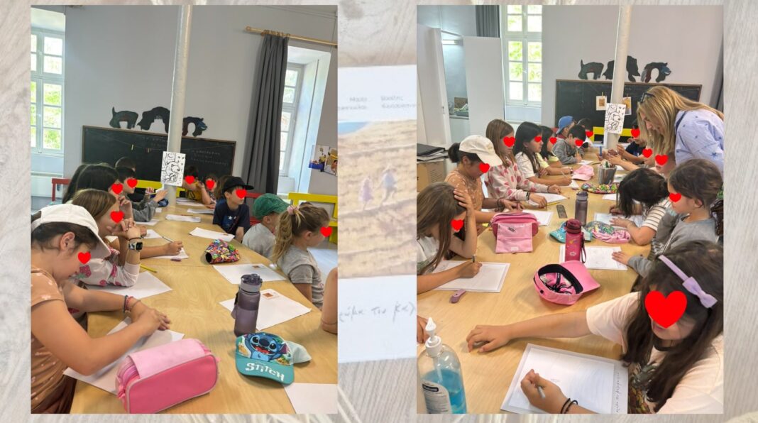 Έτσι και τα παιδιά με τις ιδέες τους προσπάθησαν να βοηθήσουν τον ζωγράφο να βρει την έμπνευση αναζητώντας το χρώμα του καλοκαιριού γύρω τους, στους ανθρώπους, στους φίλους τους στα βιώματα και τα ακούσματά τους, στη φύση της Τήνου, στις δικές τους εμπειρίες από το καλοκαίρι στο νησί τους.