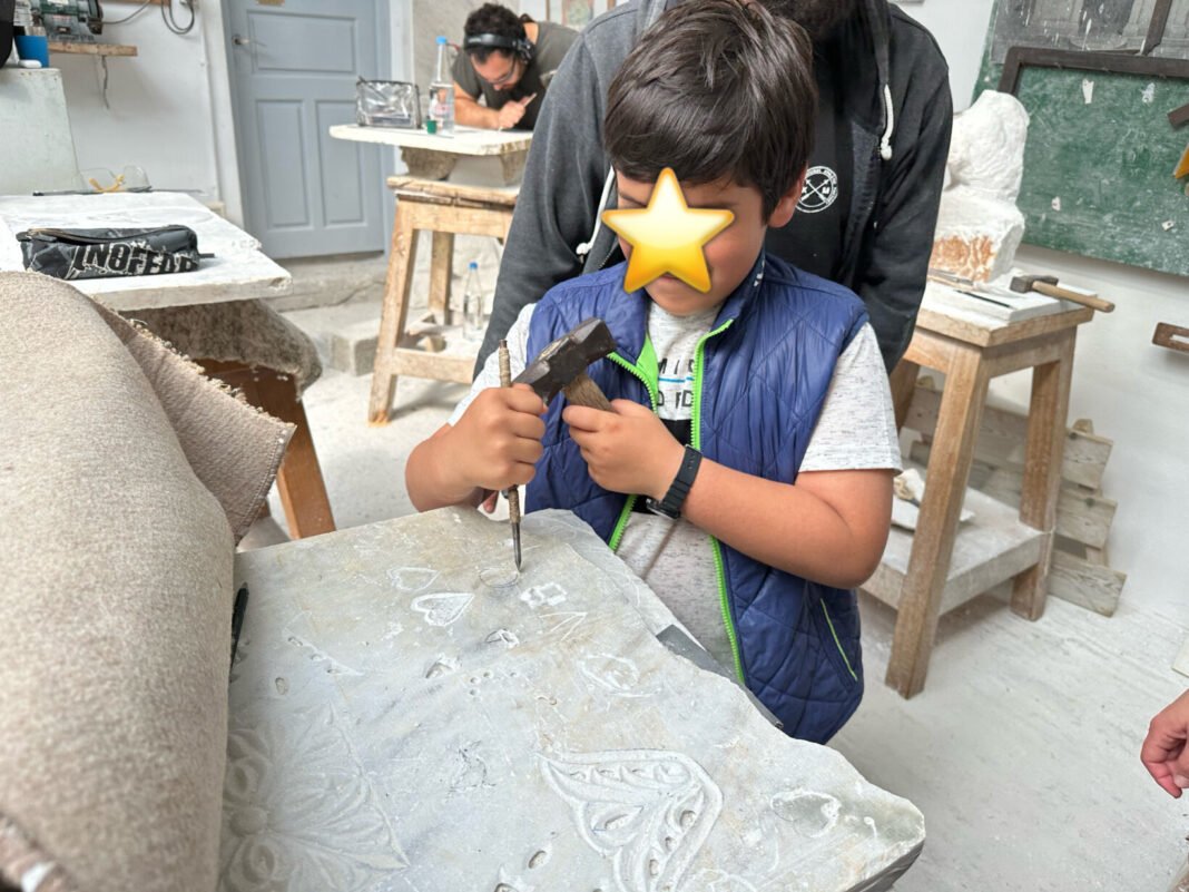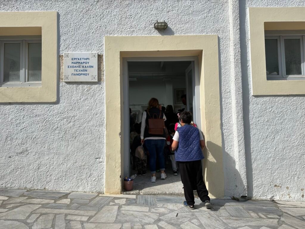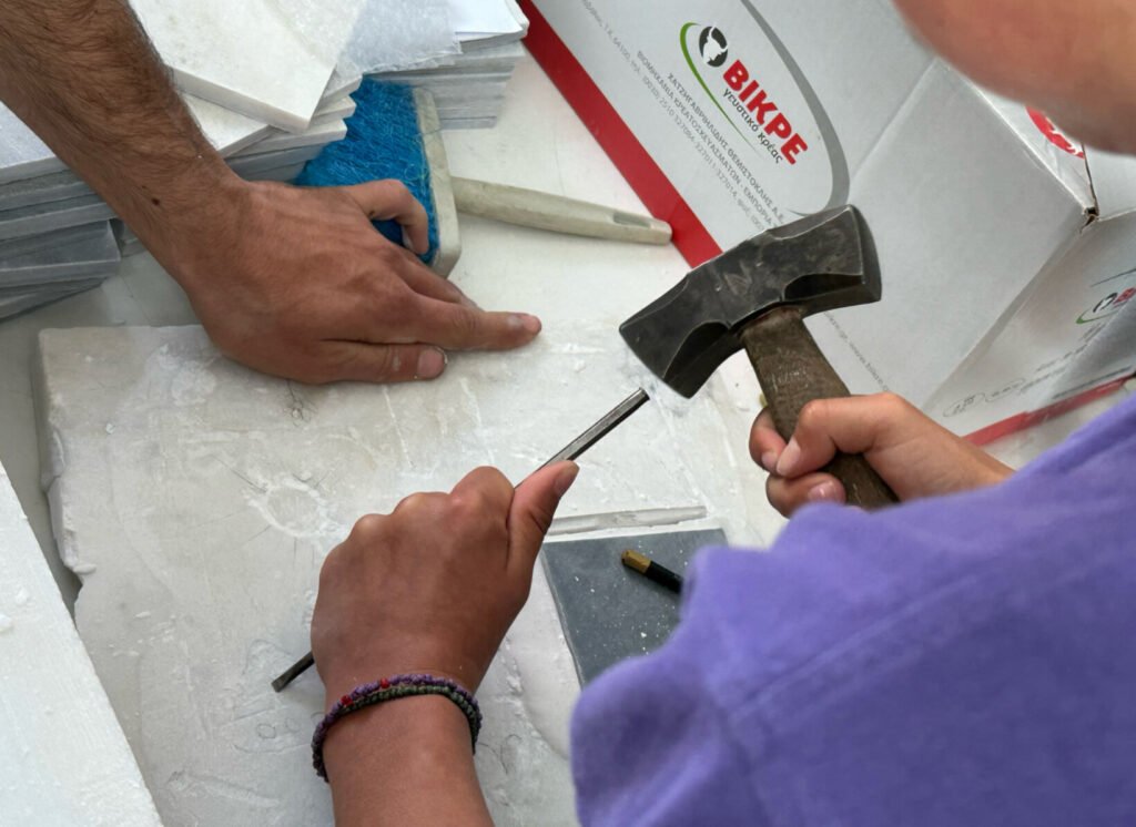 Οι ίδιοι οι σπουδαστές παρουσίασαν στα παιδιά τα έργα με τα οποία εκείνη την ώρα ασχολούνταν και με ιδιαίτερη χαρά έδειξαν τον τρόπο και τις τεχνικές που σκαλίζουν το μάρμαρο. Επιπλέον, βοήθησαν τα παιδιά να σκαλίσουν και τα ίδια με καλέμι και ματρακά δικά τους σχέδια, κάτι το οποίο τα ενθουσίασε ιδιαίτερα.