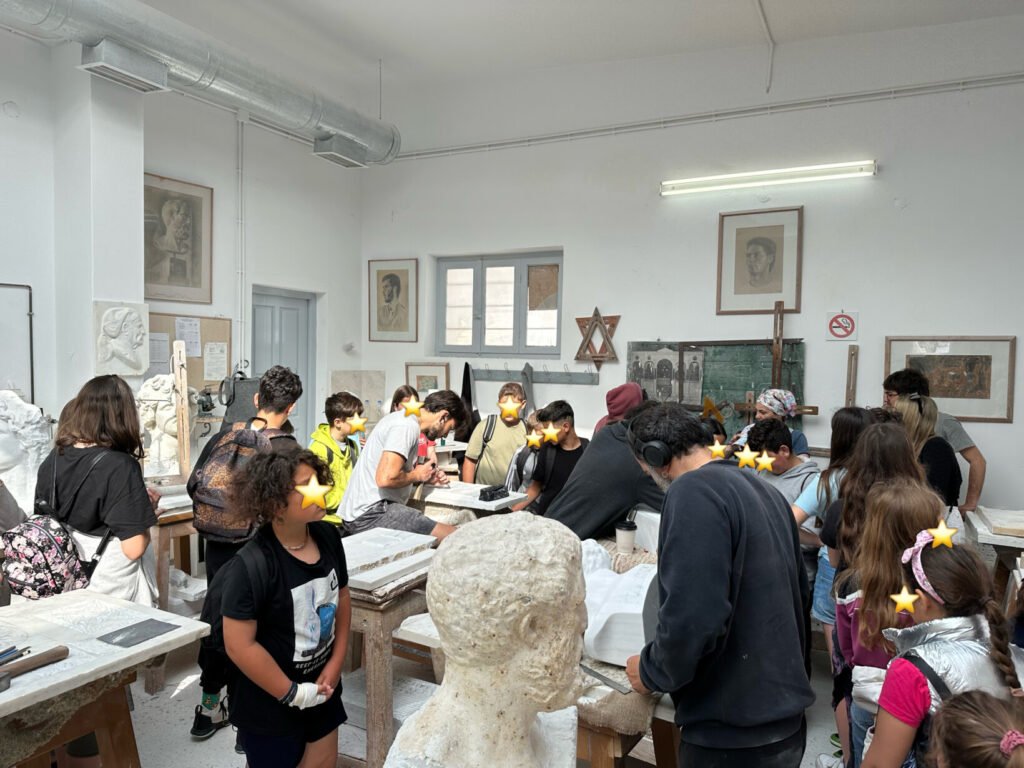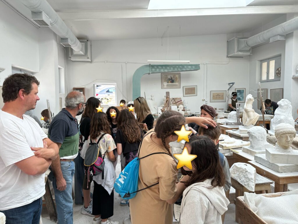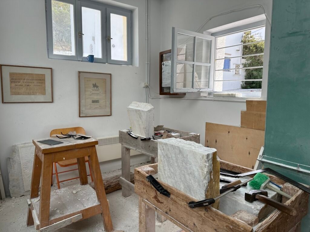 Εκεί μας υποδέχθηκαν ο διευθυντής της Σχολής Καλών Τεχνών κ. Χαλεπάς Λεωνίδας, ο καθηγητής μαρμαρογλυπτικής κ. Συλίκος Γεώργιος και οι σπουδαστές της Σχολής.