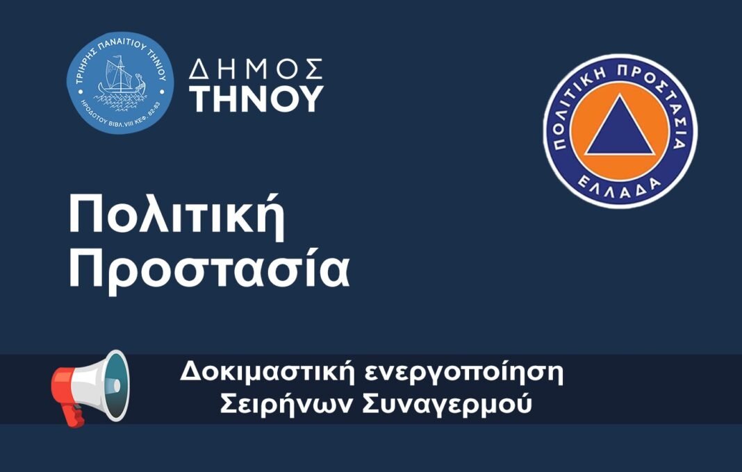 Ο Δήμος Τήνου ενημερώνει τους πολίτες ότι την Τετάρτη 1 Οκτωβρίου 2025, στο πλαίσιο της πανελλαδικής άσκησης Πολιτικής Προστασίας «ΑΝΤΙΟΧΟΣ-25»και της στρατιωτικής άσκησης «ΠΑΡΜΕΝΙΩΝ-25», θα πραγματοποιηθεί σε όλη τη χώρα –και στον Δήμο μας– δοκιμαστική ενεργοποίηση σειρήνων συναγερμού και κωδωνισμών εκκλησιών.