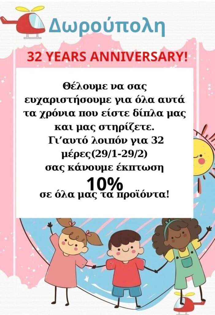 Θέλουμε να σας ευχαριστήσουμε για όλα αυτά τα χρόνια που είστε δίπλα μας και μας στηρίζετε.Για αυτό λοιπόν για 32 μέρες (29/1 – 29/2) σας κάνουμε έκπτωση 10% σε όλα μας τα προϊόντα!