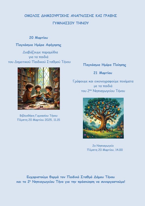 Ο Όμιλος Δημιουργικής Ανάγνωσης και Γραφής του Γυμνασίου Τήνου συνεργάστηκε με δύο εκπαιδευτικές μονάδες του νησιού για να γιορτάσει την Παγκόσμια Ημέρα Αφήγησης (20 Μαρτίου) και την Παγκόσμια Ημέρα Ποίησης (21 Μαρτίου).