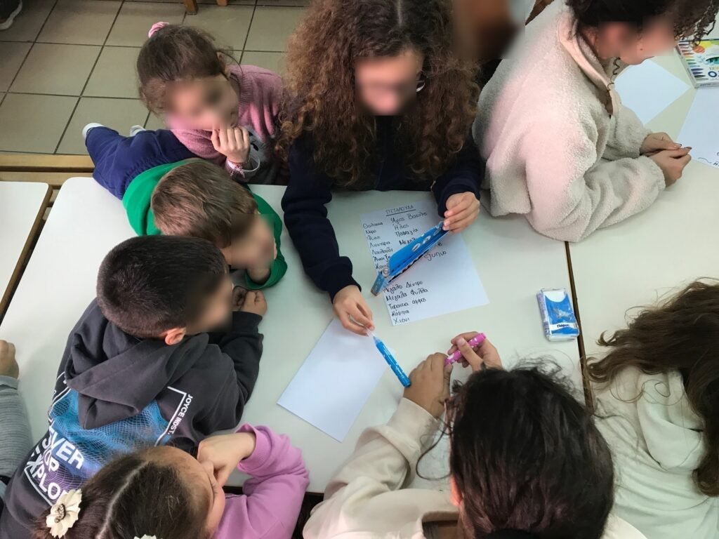 Δημιουργήσαμε 6 ομάδες που αποτελούνταν από 2 μαθητές του Ομίλου του Γυμνασίου και 3-4 μαθητές του Νηπιαγωγείου. Η κάθε ομάδα πήρε ως θέμα μια λέξη-κλειδί σχετική με την Άνοιξη: ήλιος, άνοιξη, λουλούδια, αμυγδαλιά, πεταλούδα και θάλασσα. Τα μικρά παιδιά σκέφτηκαν όσες λέξεις τους έρχονταν στο μυαλό σχετικά με το θέμα αυτό και στη συνέχεια τα μεγάλα παιδιά χρησιμοποίησαν τις λέξεις για να φτιάξουν ποιήματα. Στο τέλος, οι μαθητές του νηπιαγωγείου εικονογράφησαν τα ποιήματα με σχετικές ζωγραφιές. Ήταν μια πολύ δημιουργική δραστηριότητα που απολαύσαμε μικροί και μεγάλοι!