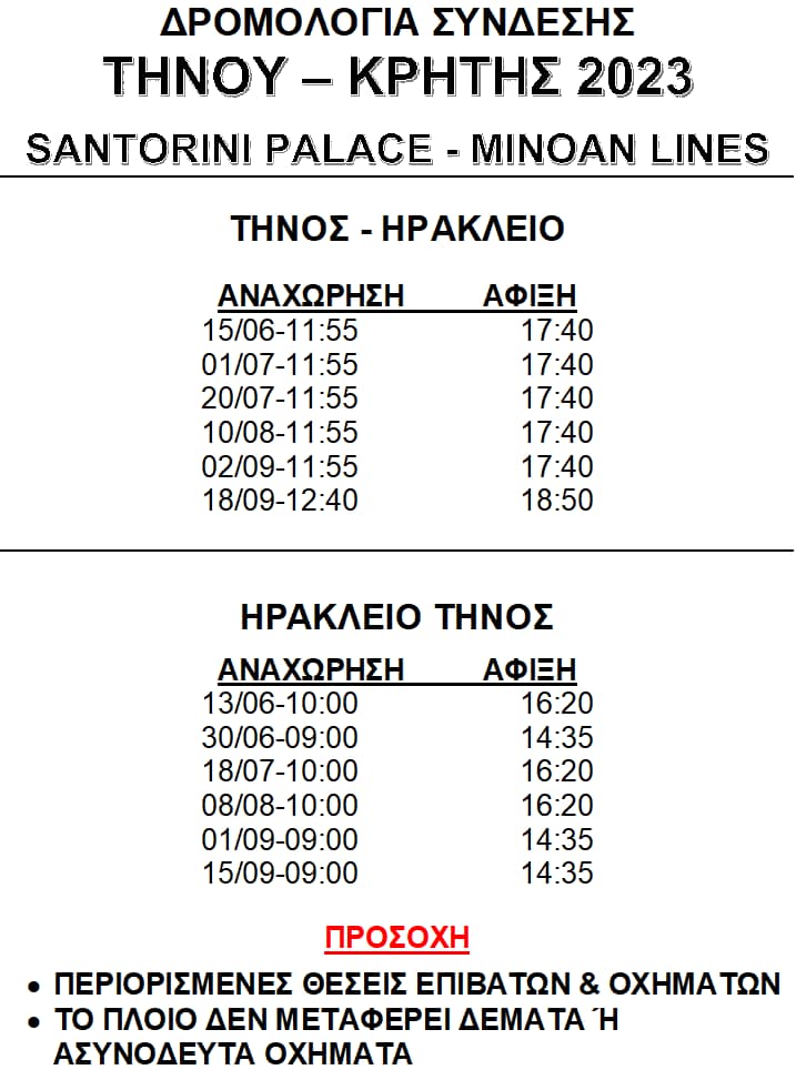 Το Santorini Pallace ξεκίνησε τα δρομολόγια για τη σύνδεση των Κυκλάδων με την Κρήτη. Συγκεκριμένα η σύνδεση της Τήνου με το Ηράκλειο θα πραγματοποιηθεί στις παρακάτω ημερομηνίες: