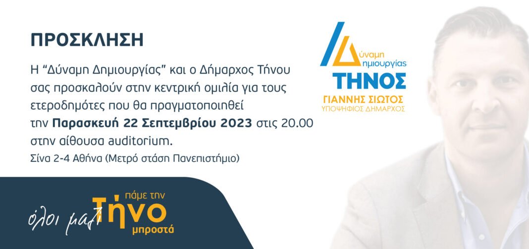 Η “Δύναμη Δημιουργίας” και ο Δήμαρχος Τήνου σας προσκαλούν στην κεντρική ομιλία για τους ετεροδημότες που θα πραγματοποιηθεί την Παρασκευή 22 Σεπτεμβρίου 2023 στις 20.00 στην αίθουσα auditorium.