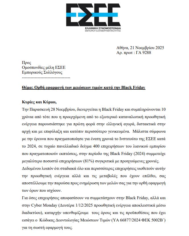 Επίσης, σας επισυνάπτουμε εγκύκλιο της ΕΣΕΕ για την ορθή εφαρμογή των μειώσεων τιμών κατά την Black Friday .
