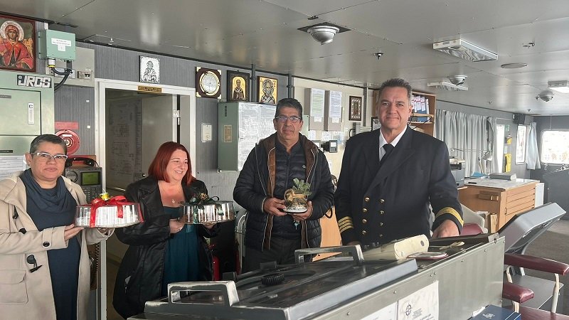Το πλοίο καλωσόρισε, όπως κάθε χρόνο εδώ και έξι (6), ο Εμποροεπαγγελματικός & Βιοτεχνικός Σύλλογος Τήνου. Ο πρόεδρος κ. Τσιμέκης Ανδρέας, η γενική γραμματέας κ. Κολλάρου Λουκία και η ταμίας κ. Κολλάρου Πετρίνα εκπροσώπησαν το Δ.Σ. του Συλλόγου και πρόσφεραν στον καπετάνιο κ. Βερβένιωτη Ηλία , στους αξιωματικούς και στο πλήρωμα ένα γούρι και γλυκά.